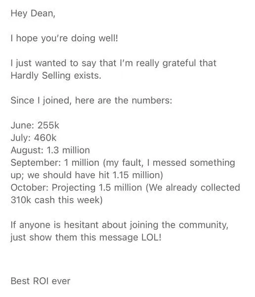 That’s exactly what we build at Hardly Selling. We’ve helped sales teams across industries generate over $10M/month in combined deal flow — without hiring new reps or touching ad spend.